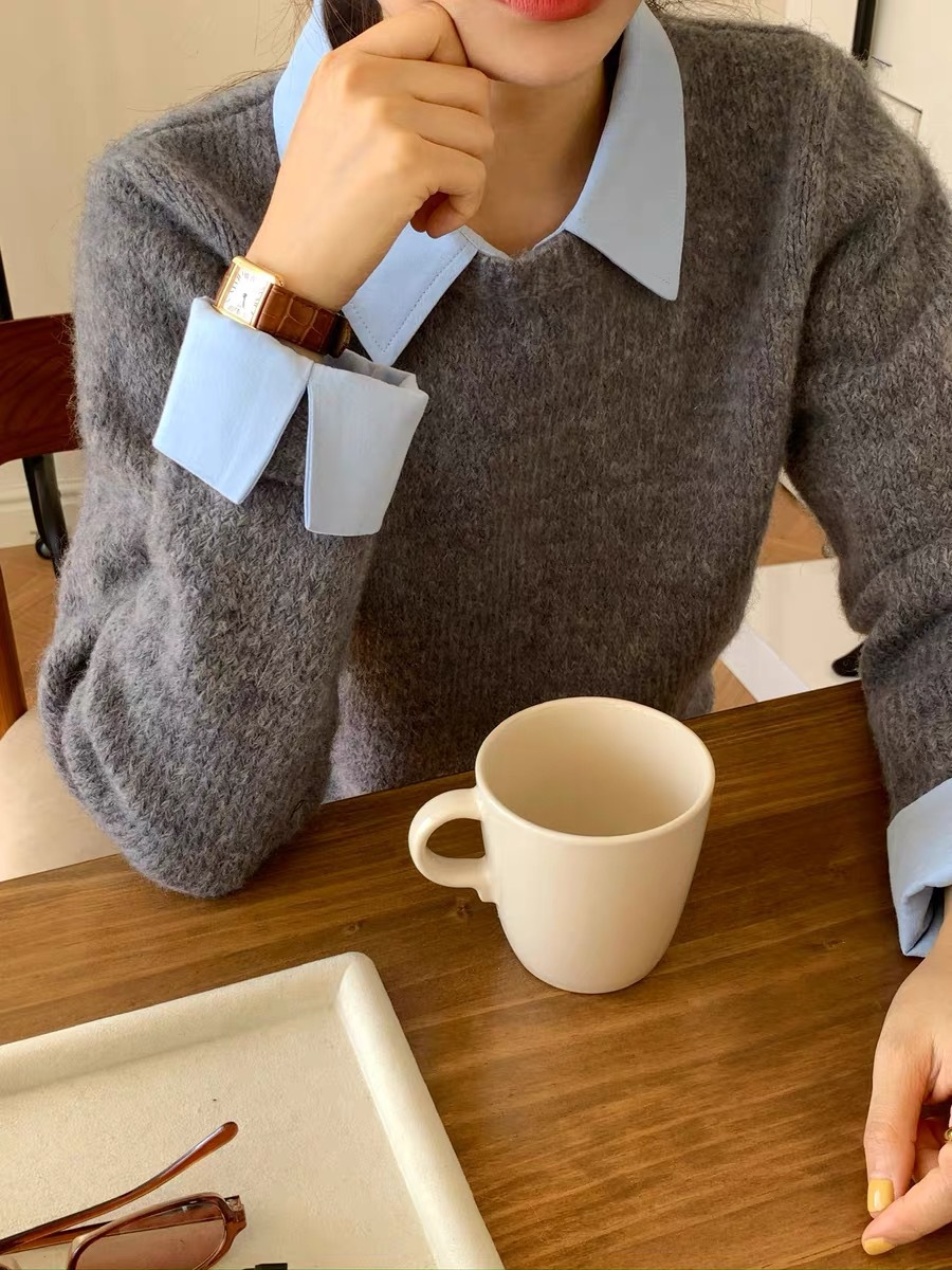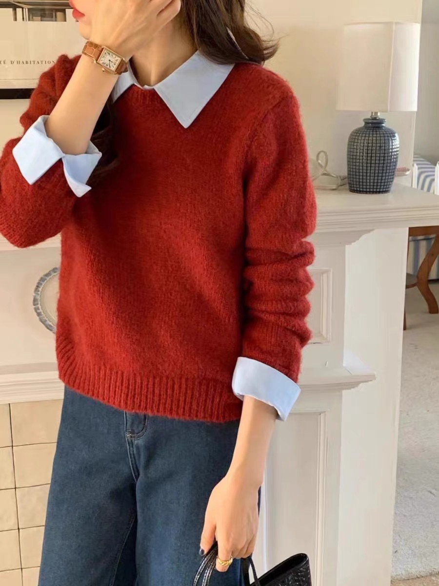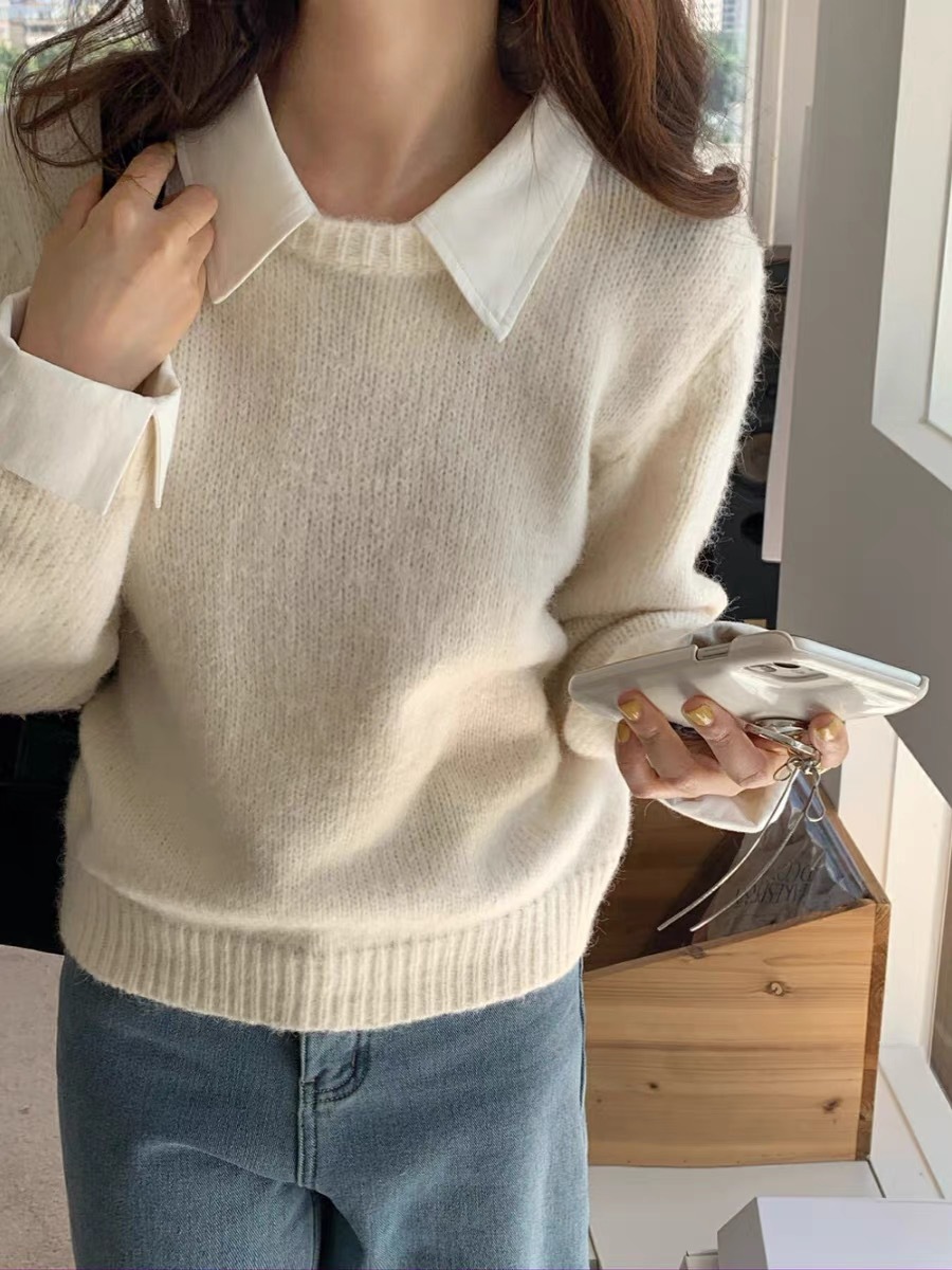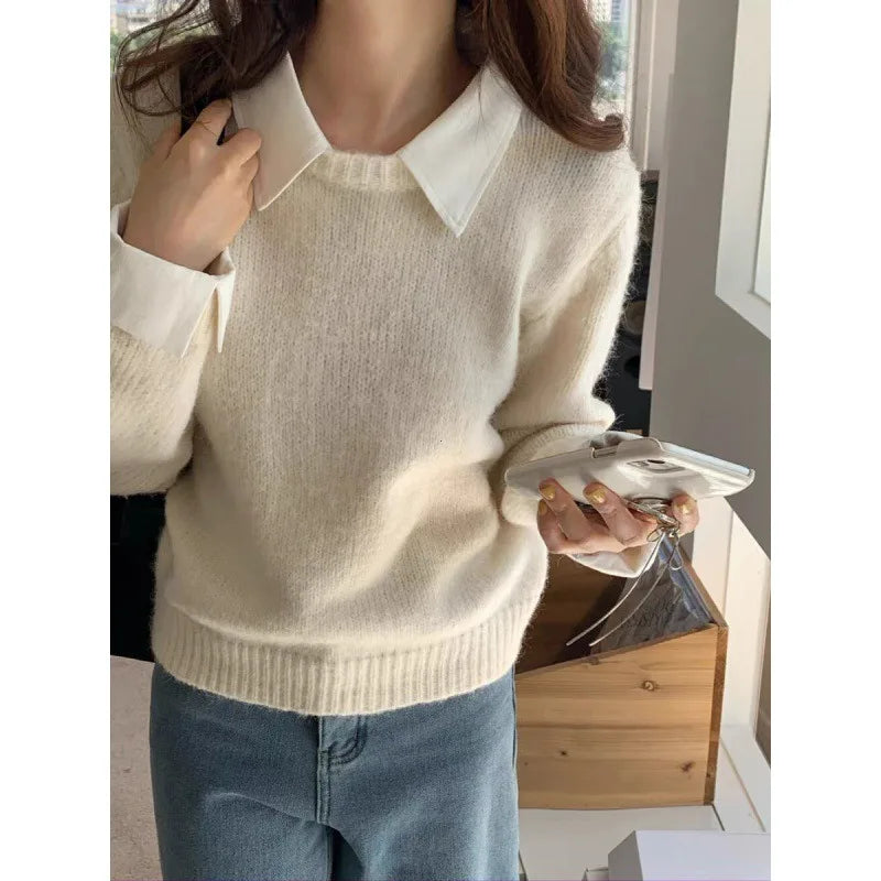 2024 New Patchwork Shirt Collar Knit Sweater Autumn and Winter Bottoming Shirt Temperament Fake Two Pieces Top Pullover