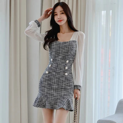 Korean Elegant Office Dress Women Casual Square Collar Chiffon Stitching Tweed Mini Sweet Mermaid Slim Female Vestido Streetwear
