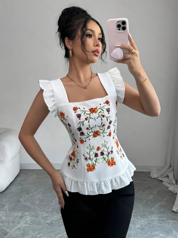 Neploe Bohemian Flower Women Blusas Sexy Sleeveless Ruffles Slim Crop Top Summer Fashion Ladies Blouse