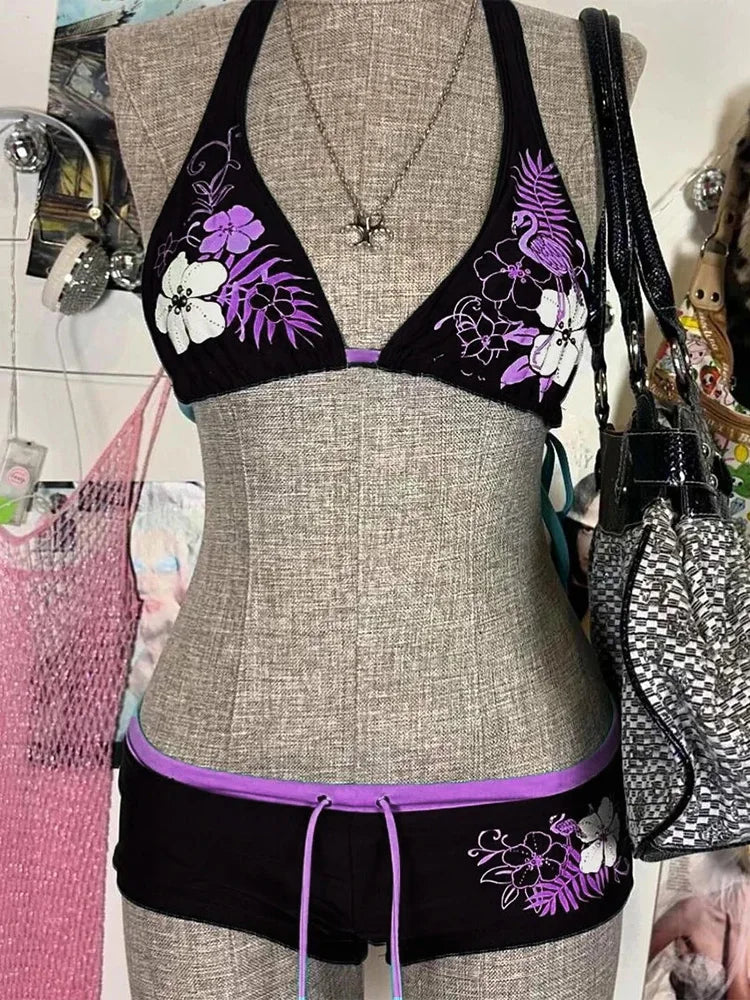 Vintage Flower print Cutie set Bikini 2000s Swimsuit Sexy Women Bathing Fashion Halter Strap Swimwear High Street Beach Female